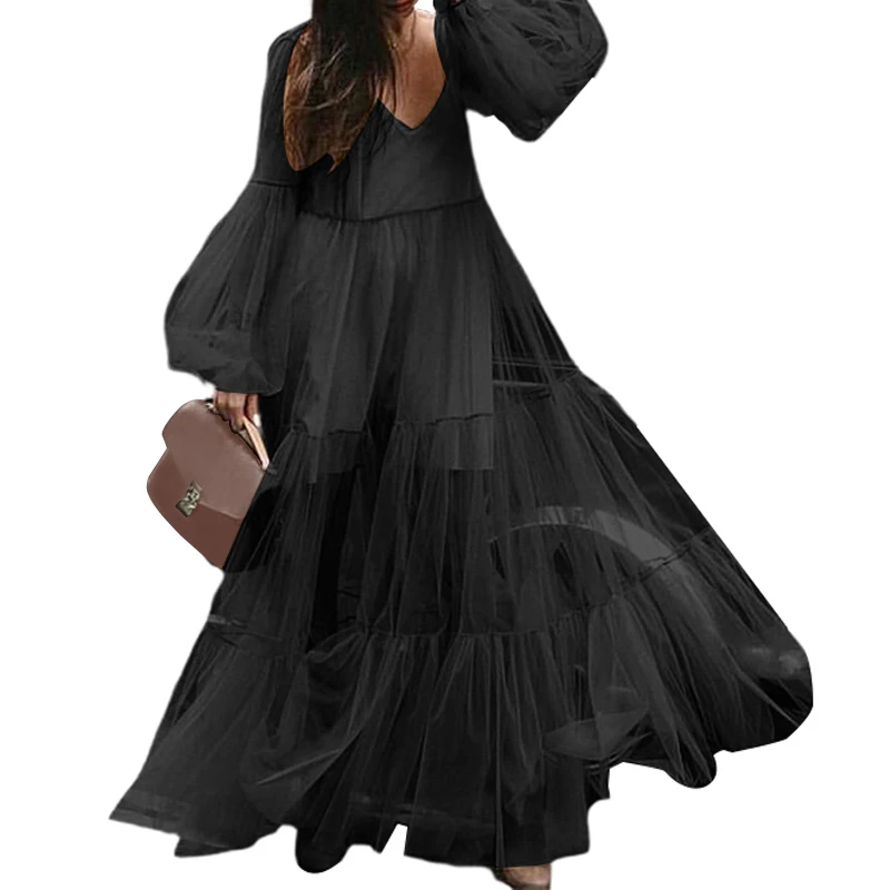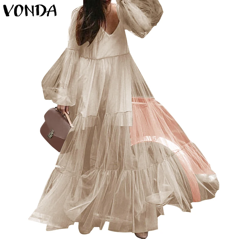 VONDA Maxi Dress Women 2019 Autumn Dress Sexy V-Neck Lantern Long Sleeve High Waist Party Dresses L